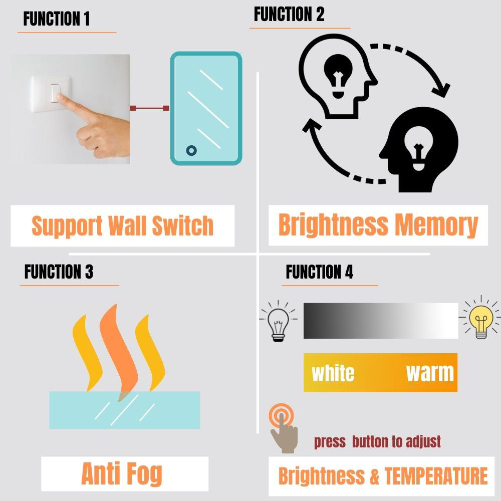 - Support wall switch & Memory Function: The built-in Memory Function can help remember your personal brightness settings. Thus the mirror can be restored to its last use state after being turned off and restarted. No need worry to reset it and continue to give your bathroom excellent lighting atmosphere.