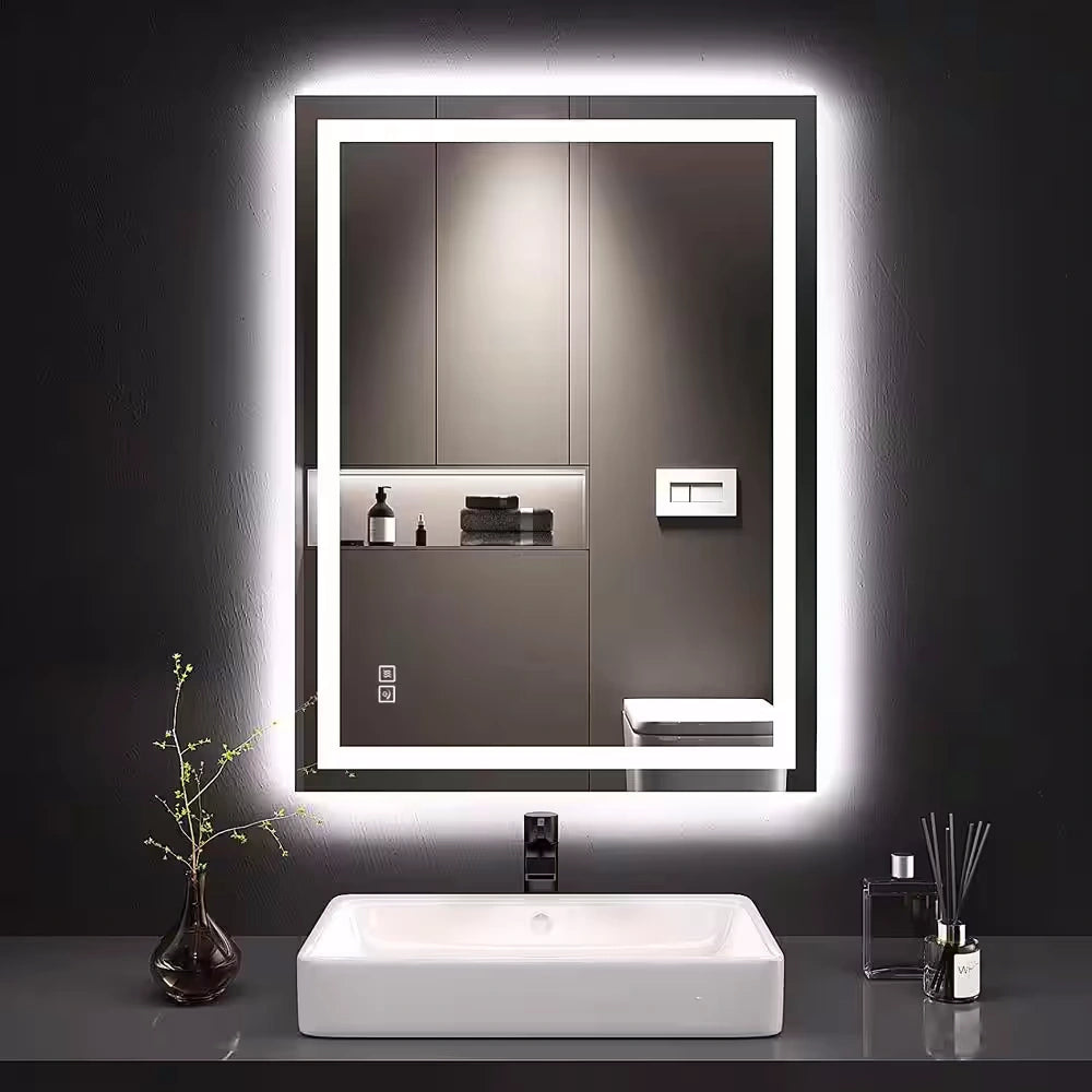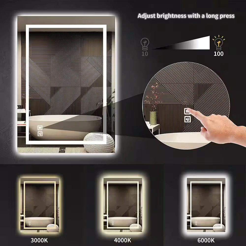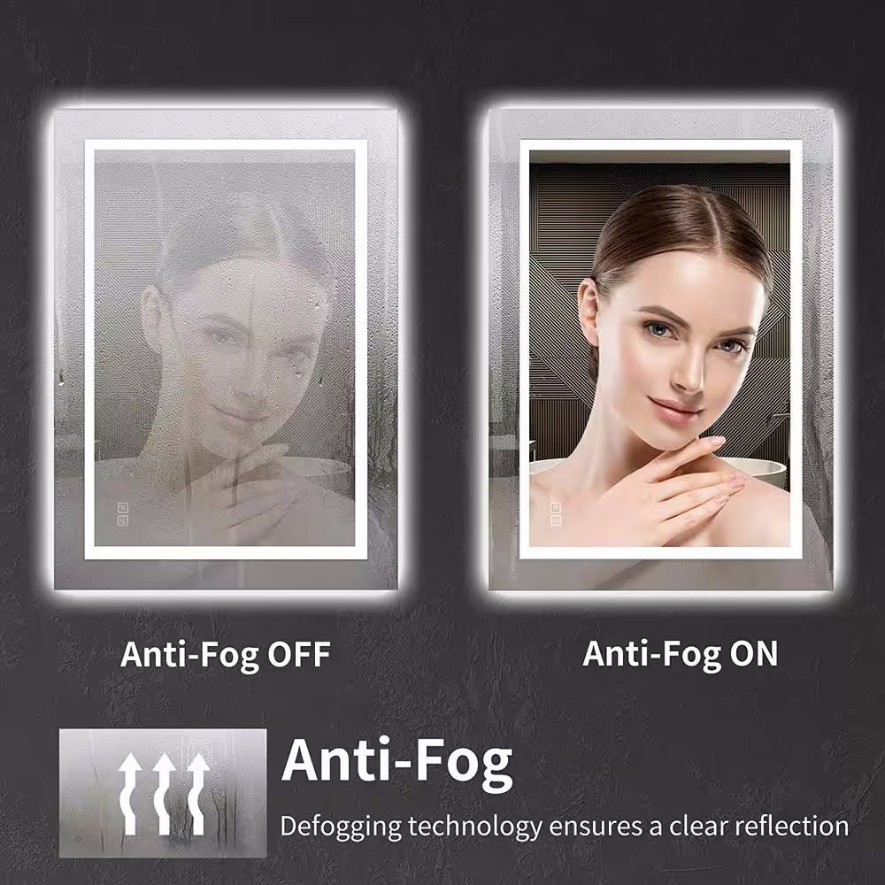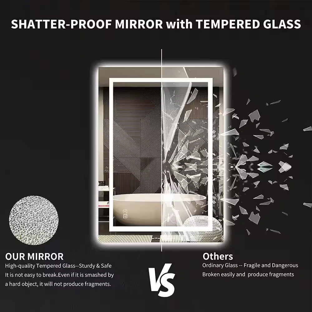 Built-in dual 75 bead/ft LED strip bathroom mirrors are brighter than regular LED mirrors. Flicker-free and UV-free bulbs provide comfortable visual lighting, a great choice for your bathroom or bedroom, it will light up your room, your face and your smile.The frameless design makes the bathroom mirror more simple and stylish, and the light is softer and more natural. LED lights have a lifespan of over 50,000 hours.The touch-sensitive on/off switch further simplifies operation and makes your day easier with just one touch. The defogger behind the mirror effectively prevents condensation on the glass and is ideal for shared or windowless bathrooms.
