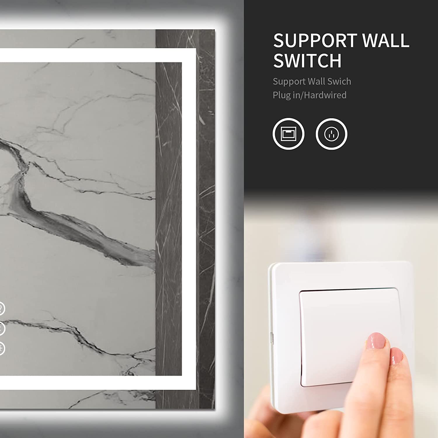 - Easy to Install & Powered by Plugin or Hard Wire - Fixed the mirror holder on the wall by screws and hang the mirror on the holder. You can use the plug for power or connect the wire to wall switch by hard wire. It is better done by a professional electrician if you want to hard-wire it.All electrical parts of this LED lighted mirror are ETL certification for US and Canada, safe to use in bathroom condition.