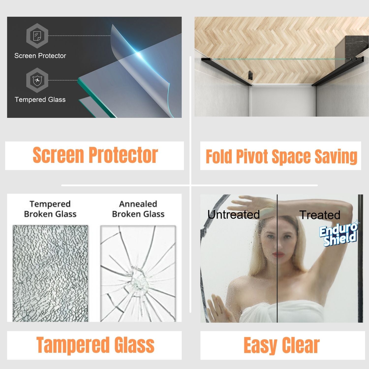 - Effective safety clear glass: 6/25 in. (6 mm) thick clear SGCC certified tempered glass.