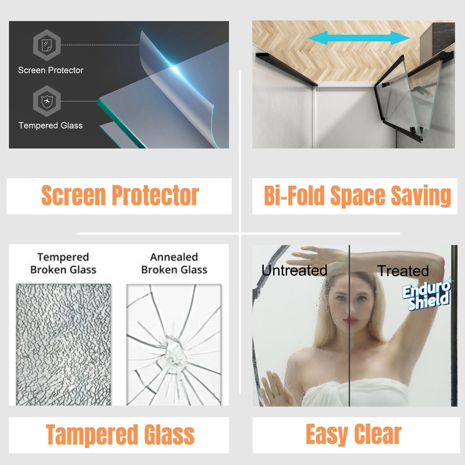- Universal fitting design: up- to-date universal fitting design, the clear glass panel or the framed are the same height line, perfect waterproof and nice, all polished aluminum frame and superior hinges are made of stainless steel, rust resistant, creating a steady and safety structure.