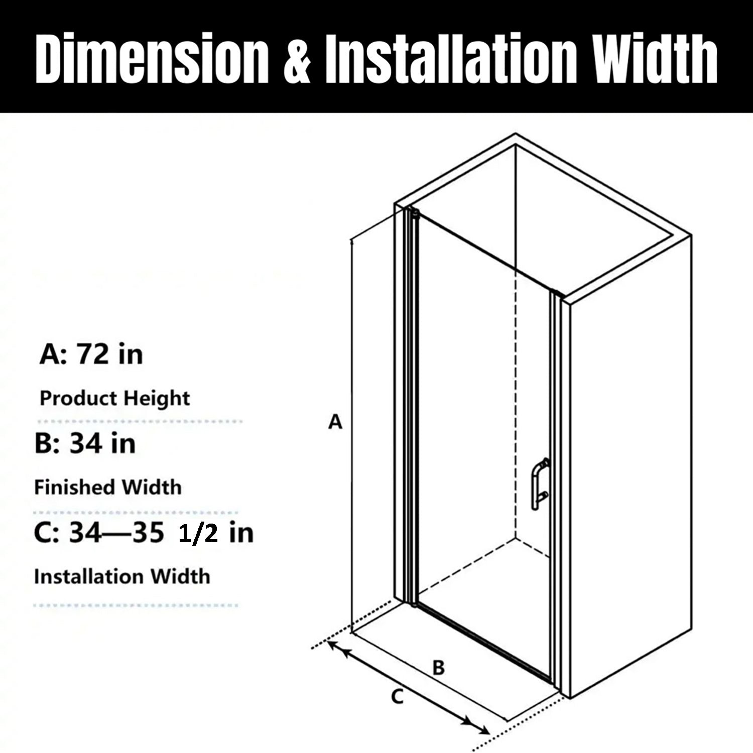 - Frameless pivot shower door: 34-35.5 in. W x 72 in. H.