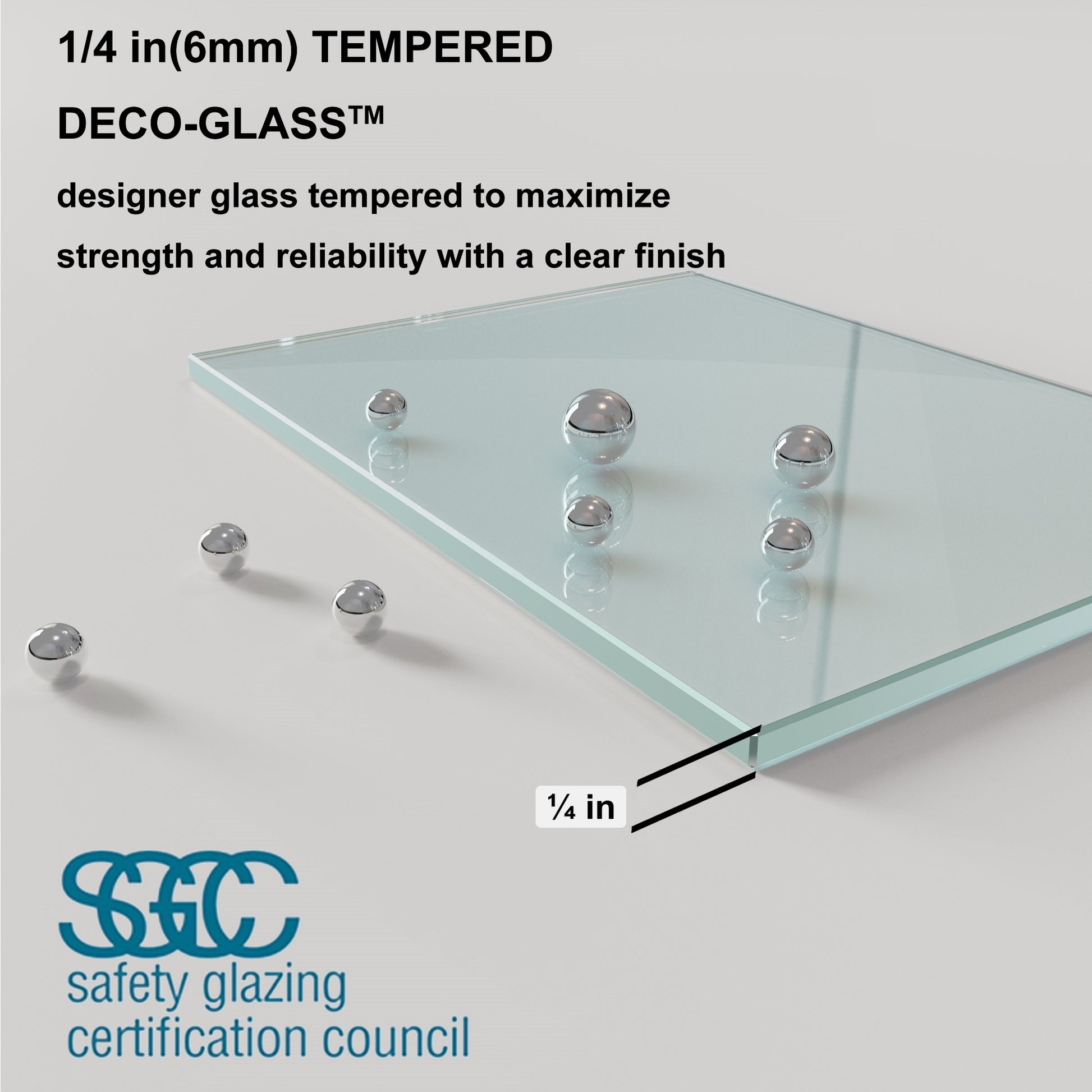 - Effective safety clear glass: 6/25 in. (6 mm) thick clear SGCC certified tempered glass.
