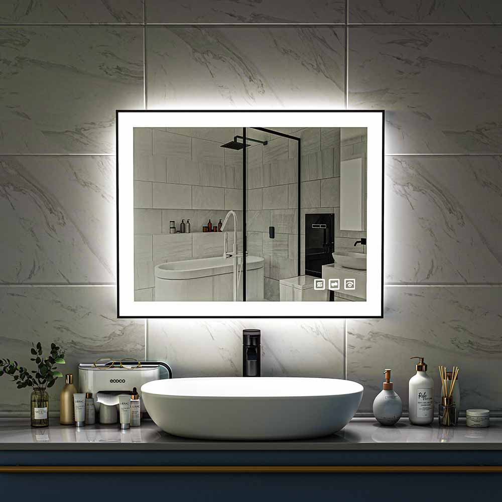 36'' W x 28'' H LED Bathroom Mirror, Fog Free, Dimmable, Black Frame, Front Light & Backlit