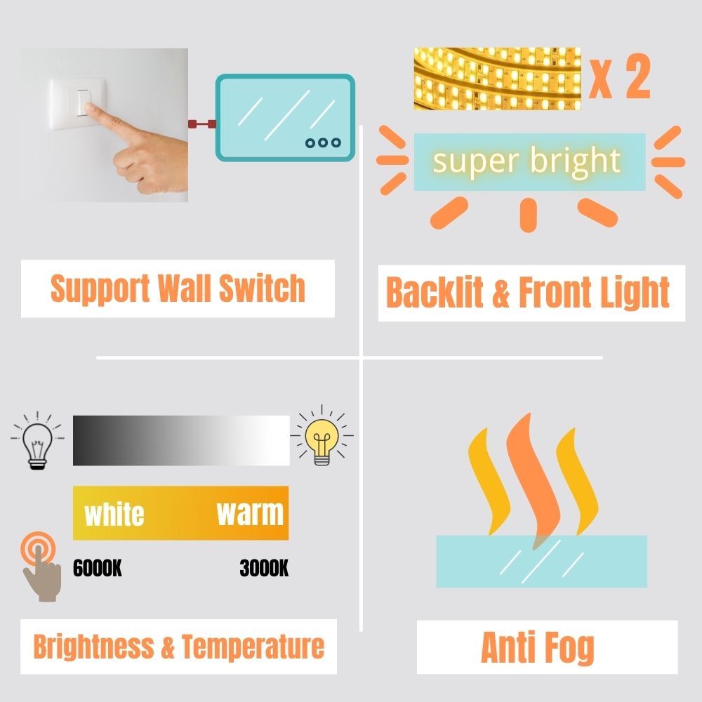 Waterproof design: this LED mirrors feature waterproof and moisture-proof backing, IP44 rate to ensure safe lighting in wet bathroom environments.