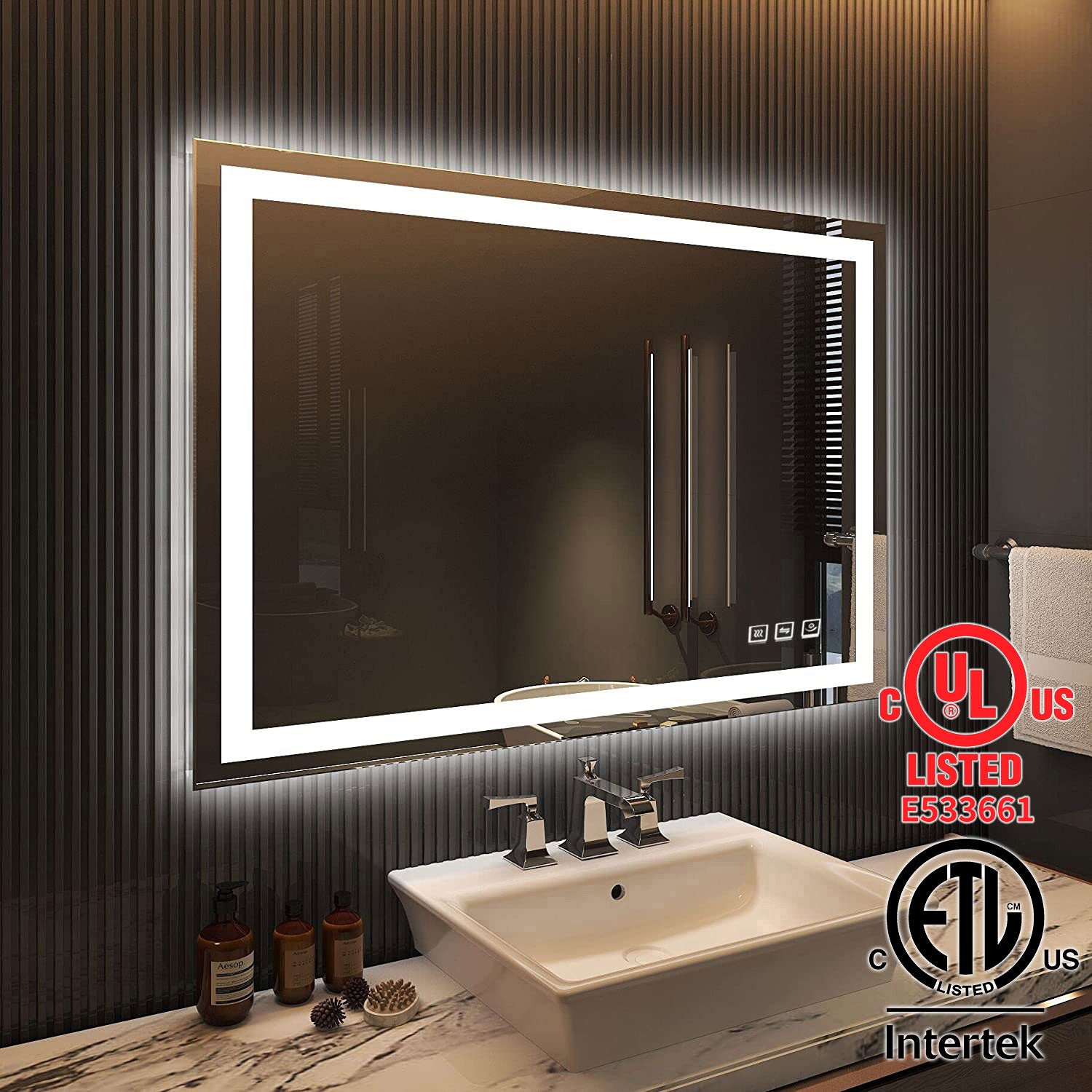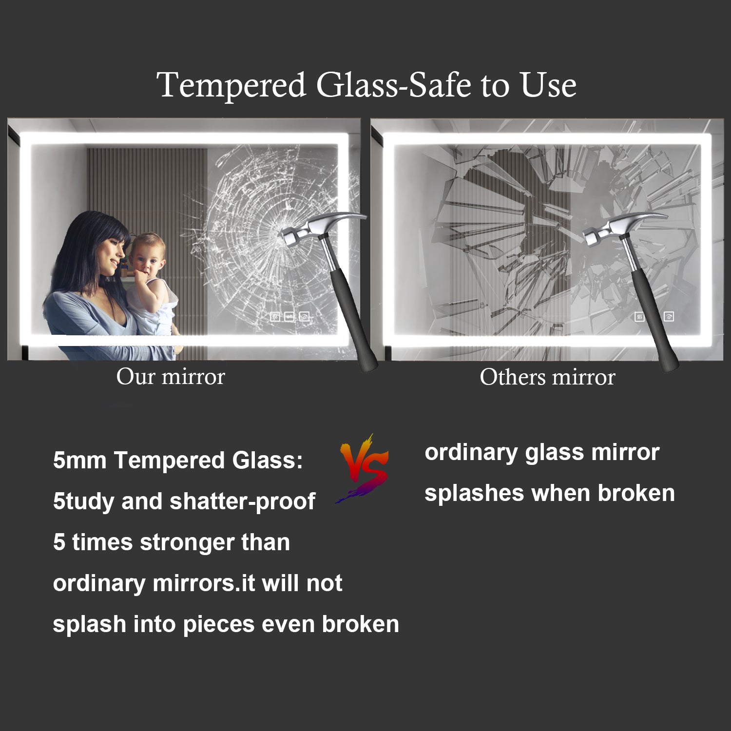 - Anti-explosion mirror glass: the mirror glass of this bathroom mirror use anti-explosion mirror glass the whole mirror keeps adhesive state even the glass burst, provide best protection, all electrical parts of this LED lighted mirror are ETL Listed for US and Canada, safe to use in bathroom condition